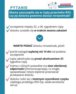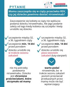 - Kobiety w ciąży, które urodzą w sezonie zakażeń RSV (październik – marzec), najlepiej by zaszczepiły się w ciąży. Szczepienie jest bezpieczne, refundowane, chroni mamę i dziecko, potem niemowlę nie będzie potrzebowało podawania przeciwciał. Więcej na ten temat tutaj.